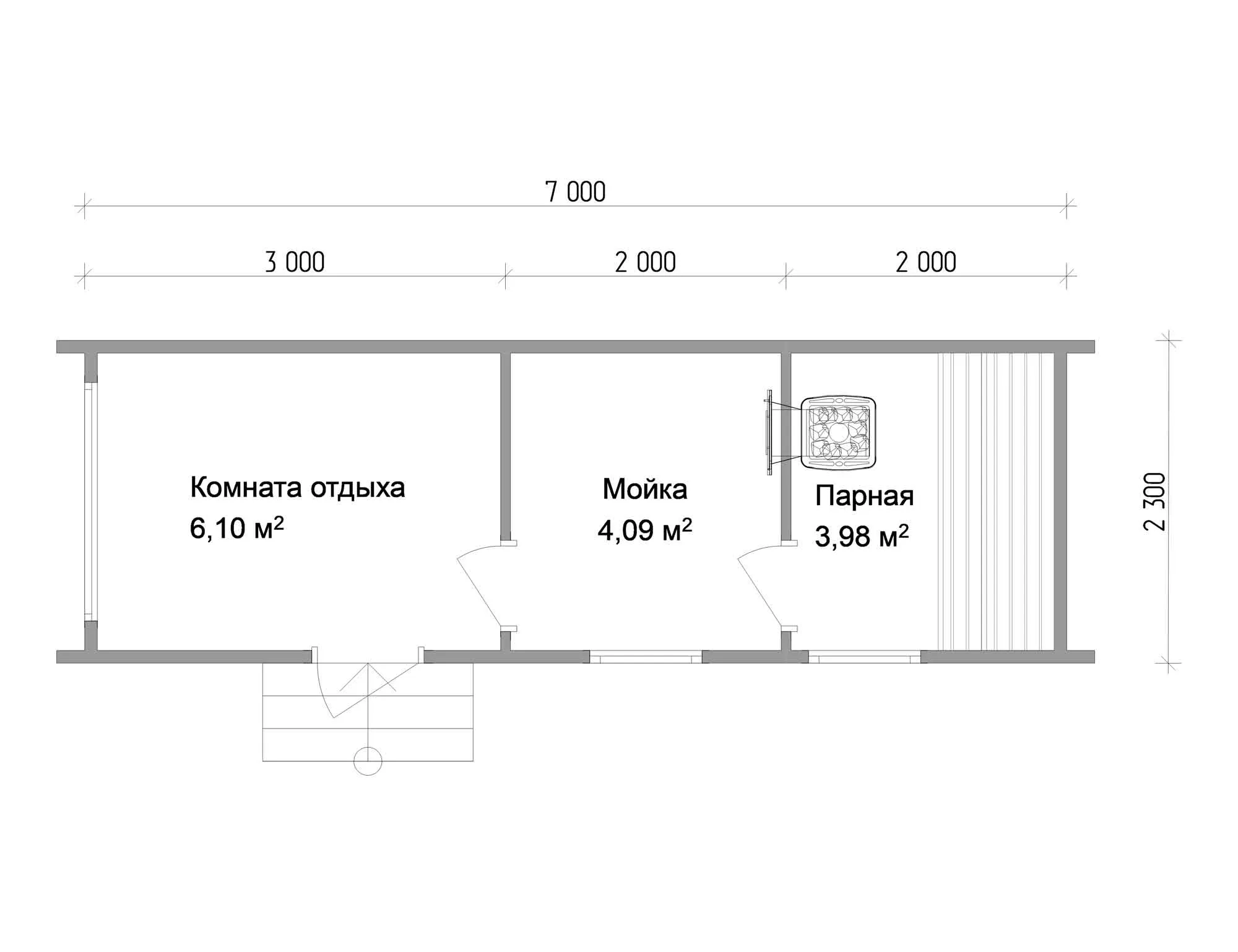 ![]() | Перевозная баня из бруса 7х2,3 с крыльцом | 7x2.3 | 16.1 | ![]() | Брус 90х140: 417 000 | Брус 140х140: 491 000 | |